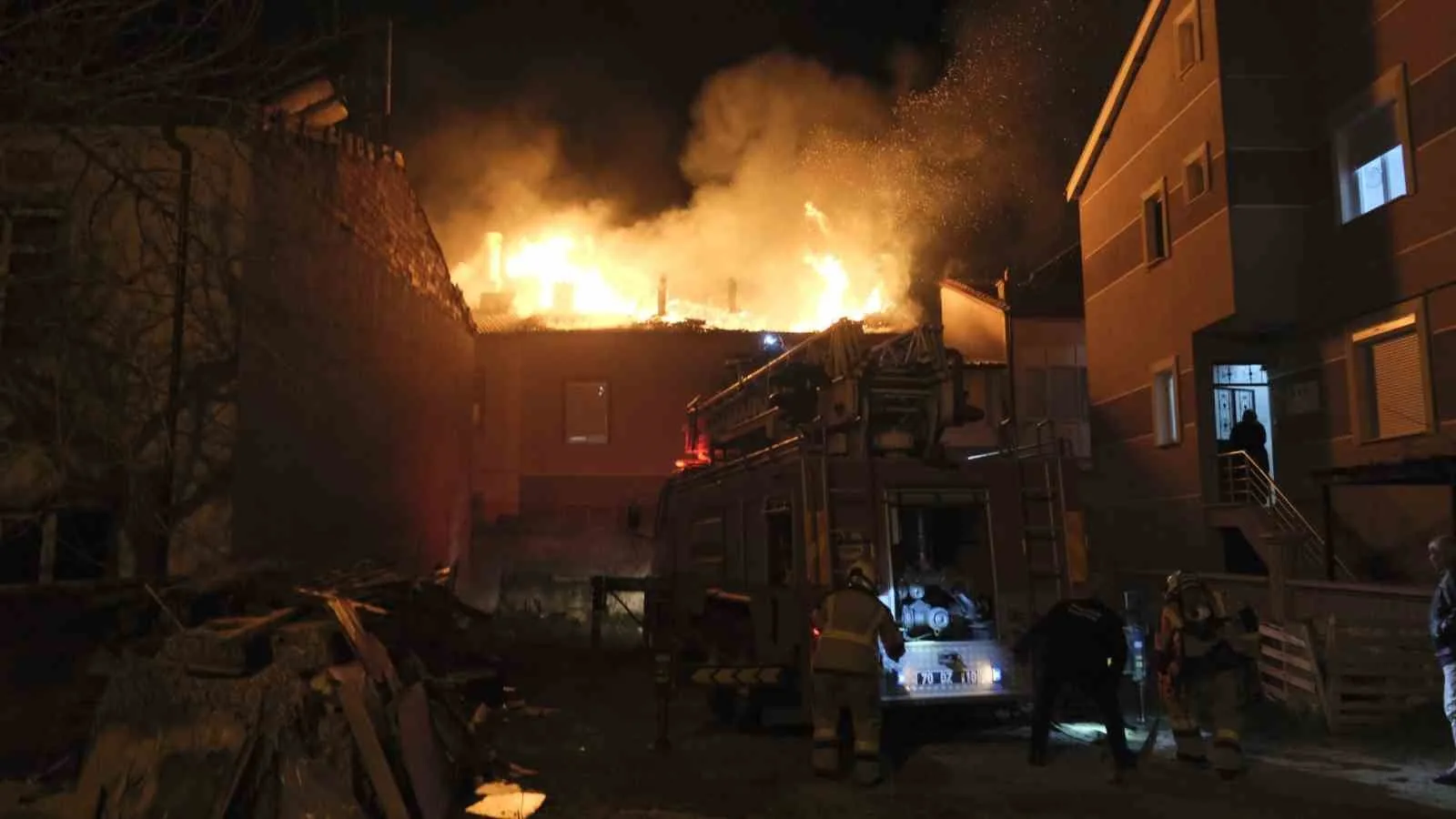 Karaman’da 2 katlı müstakil evin çatısında çıkan yangın geceyi aydınlatırken, mahalle sakinleri panikle sokağa çıktı. Yangında 3 kişi dumandan etkilendi.